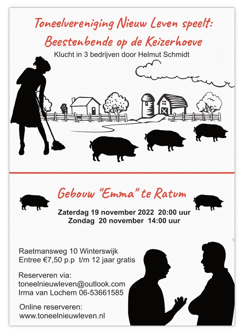 Blij zijn wij om jullie te kunnen melden dat wij naar twee jaar afwezigheid 19 en 20 november weer op de planken staan. Heeft u zin in een avond of middag lekker lachen? Zet dan nu alvast een kruis in uw agenda op 19 en 20 november 2022 want dan speelt toneelvereniging Nieuw Leven: Beestenbende op de Keizerhoeve! Een klucht in 3 bedrijven door Helmut Schmidt..